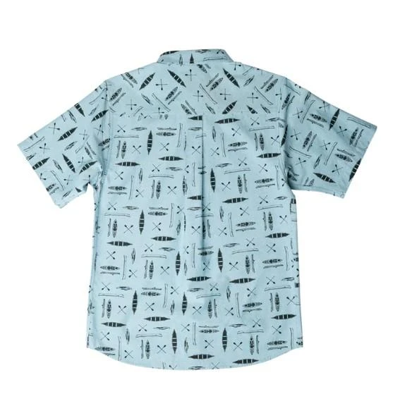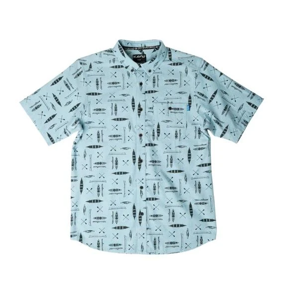 Casual fit, short sleeve button up, button-down collar with interior KAVU logo jacquard tape, single chest pocket with button closure, 25% certified recycled polyester faux wood buttons, back bias cut yoke with center back box please, curved hem.
