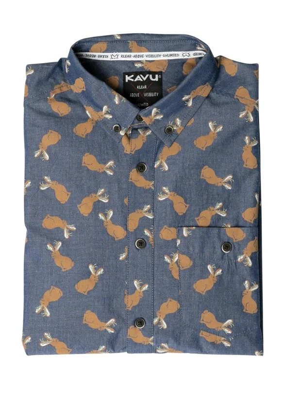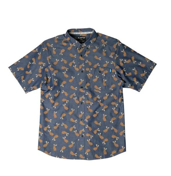 STAFF PICK! At KAVU we like to have a good time. We also like to look good. The Juan emerged from our design laboratory 4 years ago. Our beloved KAVU creatives started with a lush 4oz cotton chambray, added recycled poly faux wood buttons, and finished with a stellar pigment print. The outcome? A best selling shirt. Â
