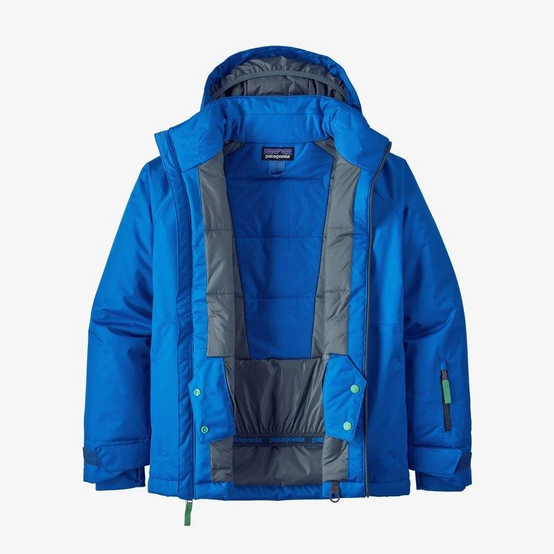 The weather-shielding Boys’ Snowshot Jacket is Patagonia’s premium ski/boarding jacket for boys built with an H2No® Performance Standard 2-layer polyester shell that has a waterproof/breathable barrier for storm protection, plus a DWR (durable water repellent) finish and fully taped seams to keep him dry. The 150-g Thermogreen® polyester (92% recycled) insulation stays warm even when wet, while lightweight polyester plain weave lines the body and sleeves to provide a smooth glide over layers. For an extra season of wear, the articulated sleeves have our grow-fit feature, which increases length by two inches. This jacket is fully featured with a removable (via snaps) three-panel hood and an internal elasticized gusset for a stay-put fit. The waterproof, center-front zipper with full-length internal wind flap has a zipper garage to prevent chin chafe. A covered zipper chest pocket has a pass-through for media cord. Pass pocket on sleeve has waterproof zipper; handwarmer pockets have covered zipper closure. The tapered sleeve cuffs provide extra coverage and adjust with hook-and-loop closure. Internal microfleece cuffs have thumb holes. The jacket has a slight drop-tail hem for extra coverage. Hand-me-down ID label.