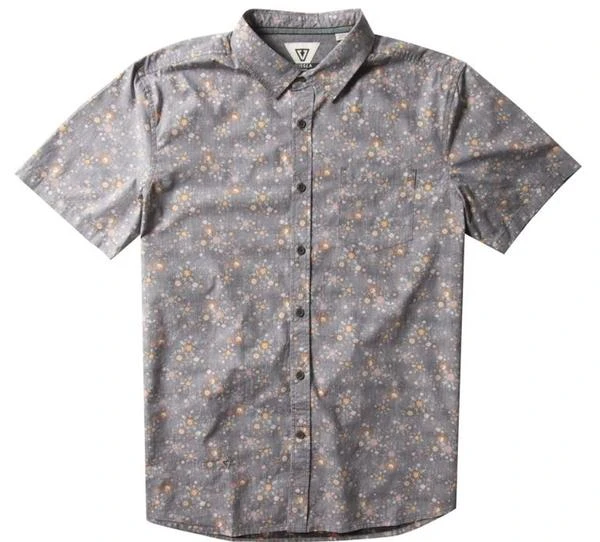 A formal button up with some zing . . . The Barrier Eco Shirt features a pleasant woven print, lightweight and made entirely with organic cotton. Styling includes a sewn in center front placket, front chest pocket and contrast chambray lining at inside back yoke. Garment washed with enzyme + softener.